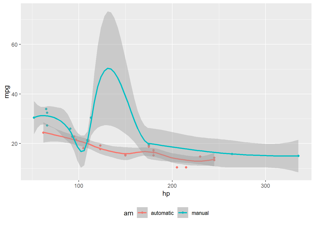 ggplot(mtcars2, aes(hp, mpg, color = am)) +