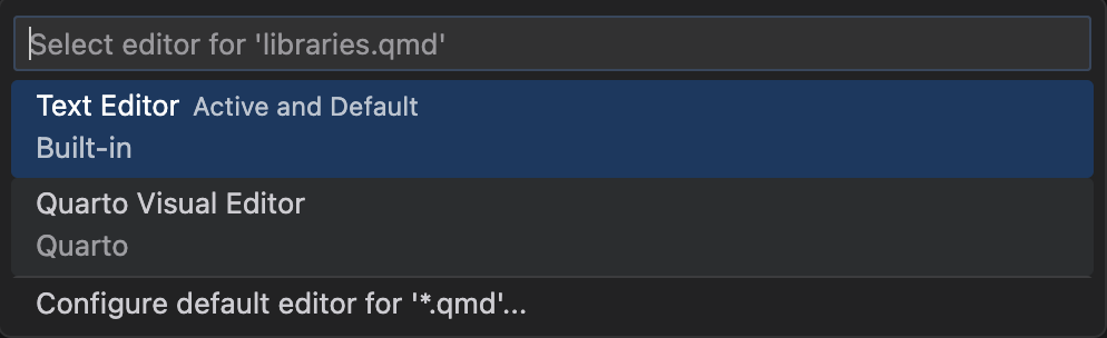 Note that this menu also provides an option to configure the default editor for .qmd files: use this if you want to primarily edit in visual mode and occasionally switch to source mode.